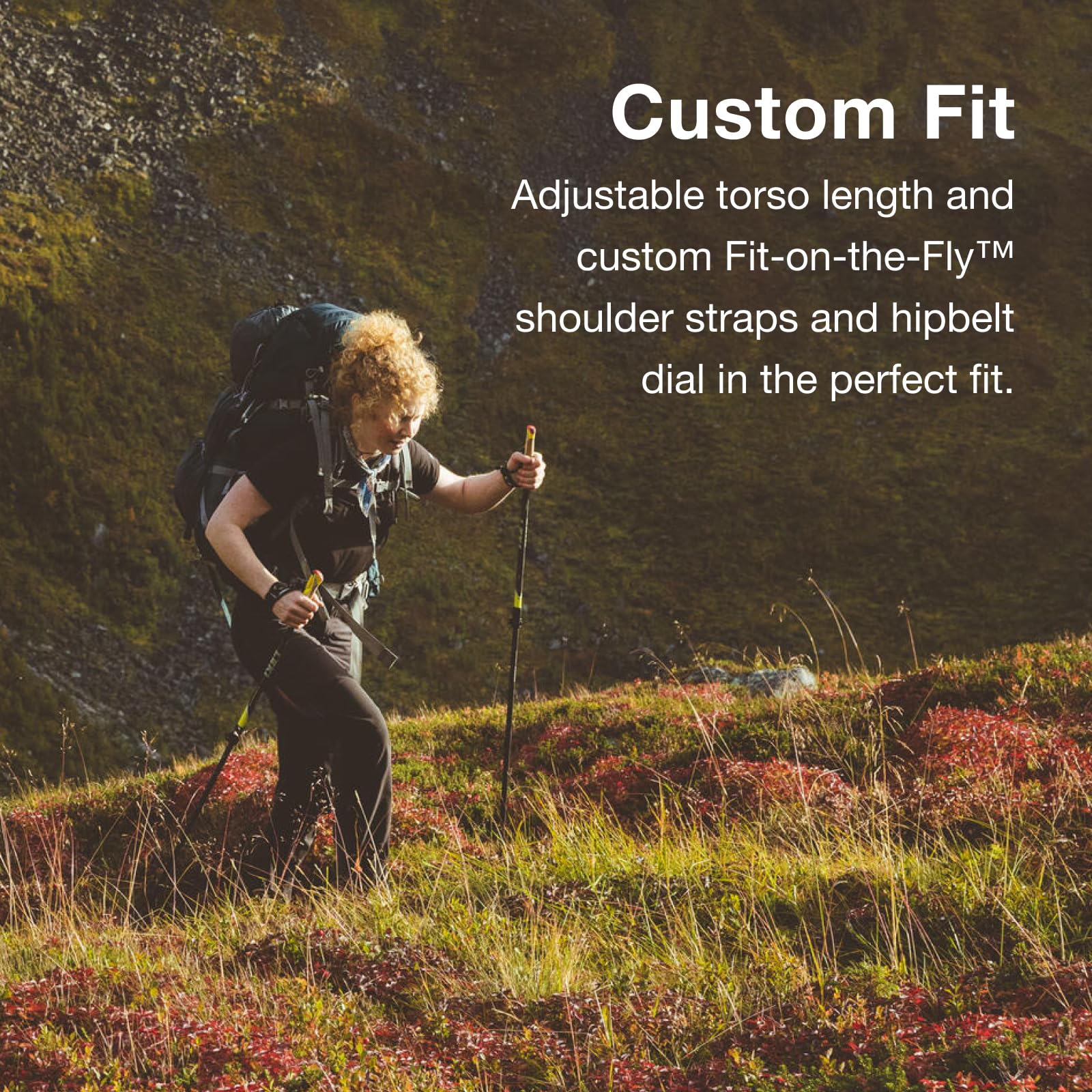 - A Custom Fit-on-the-Fly Hipbelt, Custom Fit-on-the-Fly Shoulder Strap and adjustable torso length allow for a fine-tuned fit for a variety of body shapes and sizes.